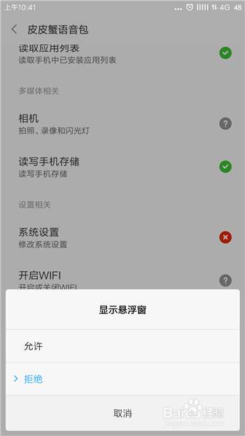 点击后会出现三个选项,点击【允许】,这样皮皮蟹语音包就有悬浮窗权限了。