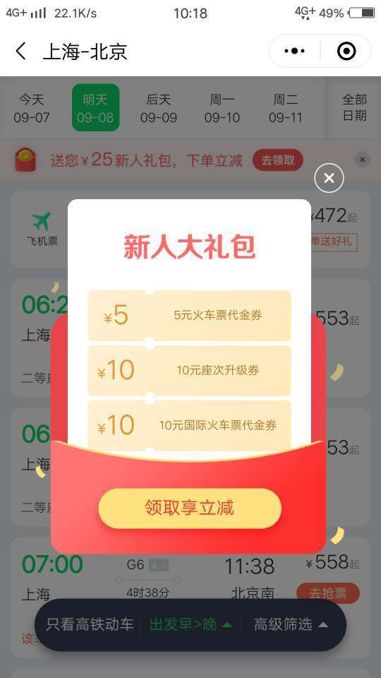 2.我们可以根据自己的需要查火车票和飞机票。注册可以获得新人礼包,帮大家优惠买到火车票。