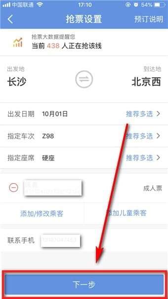 接着在设置抢票的内容,以及确定添加乘客和联系方式后,点击【下一步】