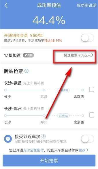 这时重点来了:如下图我们会看到APP默认选择了1.1倍的加速包,这时就需要点击【快速抢票.20元/人】打开其隐藏的功能窗口