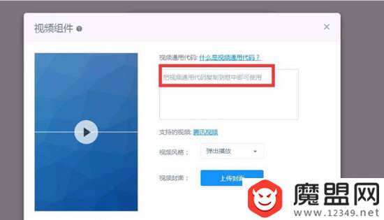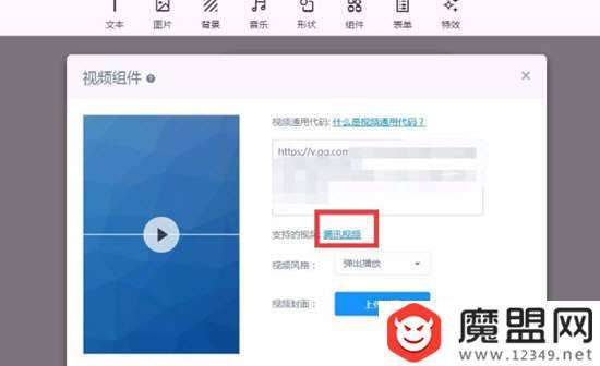 4、由于支持的视频只有腾讯视频一种,如果是想要用自己创作的视频,也只能把视频先上传在腾讯视频网站里,然后再把地址复制粘贴进来,这就可以搞定了;之后再设置视频的风格,选择弹出播放或固定播放,再然后点击“上传封面”;选项,找一个合适的封面进行上传,如下图所示: