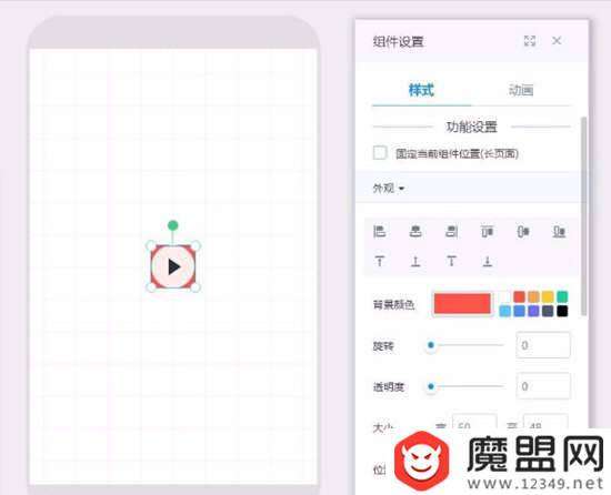 6、如果想设置视频,直接单击视频按钮,将会弹出组件设置面板,在其中可以更改按钮的样式、增加动画效果,如果要删除视频,直接按鼠标上的Delete键就可以了,如下图所示: