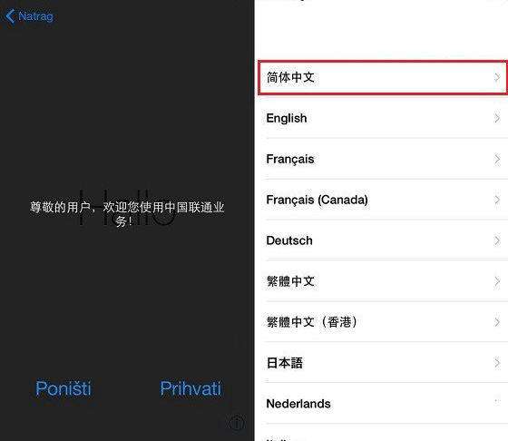 1、首先给iPhoneX安装Nano-SIM卡,安装完之后按下电源键开机,开机之后我们会看到有一个运营商网络欢迎界面,点击一下接受进入到语言选择页面,这里国内用户首选『简体中文』,如图所示。