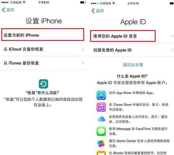 5、接下来进入的是设置iPhone页面,考虑到还是全新的iPhoneX,建议大家选择『设置为新的iPhone』,至于从什么备份恢复不需要进行设置。随后进入到Apple ID输入登录页面,如果你已经有苹果ID直接点击『使用您的Apple ID登陆』,如果你还没有苹果ID,那么就点击『创建免费的Apple ID』,记住苹果ID是非常重要的账号和密码,切记要记住,如果忘记了也一定要记得你的邮箱注册。