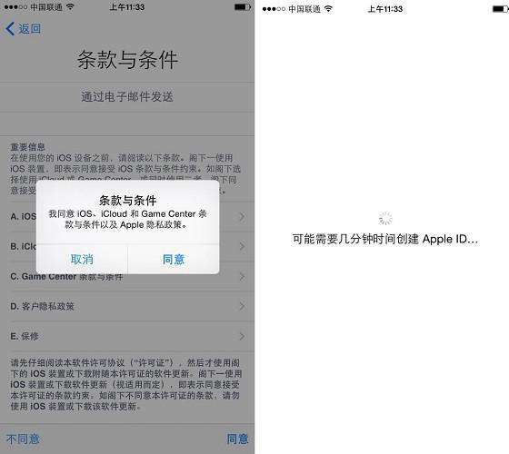 7、在接下来弹出的“条款与条件”;对话框提示中,同样点击【同意】按钮,完后后系统会有一个可能需要几分钟时间创建Apple ID的提示,这个时候不需要管,等下一步操作出现,如图所示。