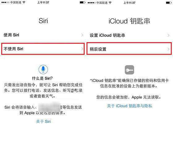 10、接下来的设置都选择否定或稍后的选项即可,如接下来的Siri和iCloud秘钥串设置中,直接选择【不使用Sari】和【稍后设置】即可,如图所示。