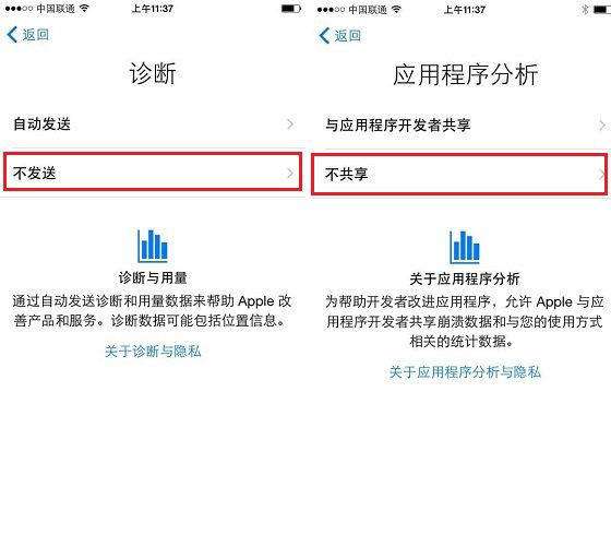 11、同样的道理,在诊断和应用程序分析设置中,我们还是直接选择【不发送】和【不共享】即可,如图所示。