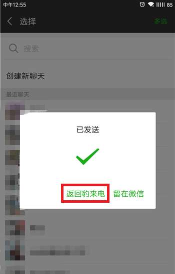 6、等待系统成功发送给好友后会提示【已发送】,点击【返回豹来电】即可,这样已经成功发送给好友了。