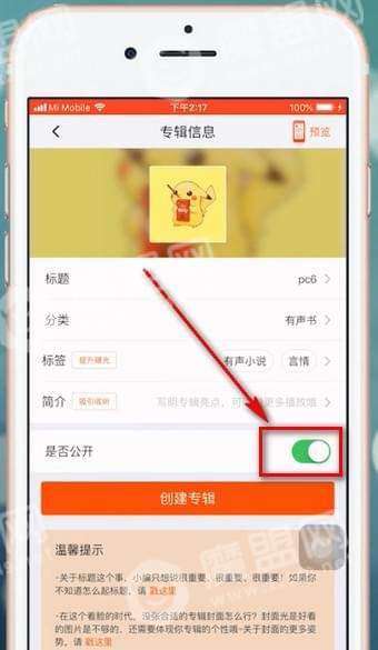 4.将是否公开选项选中,使其关闭,专辑就设为私密了,将音频上传到此专辑即可。