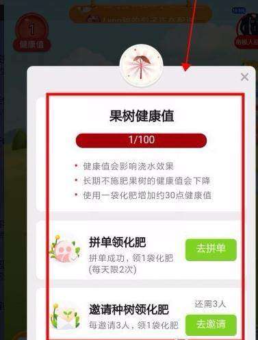1.大家通过个人中心点击进入果园后,点击果园窗口左上角的健康值按钮,就可以看到获得肥料的方法了。