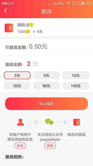 1、首次需要2元提现,之后5元