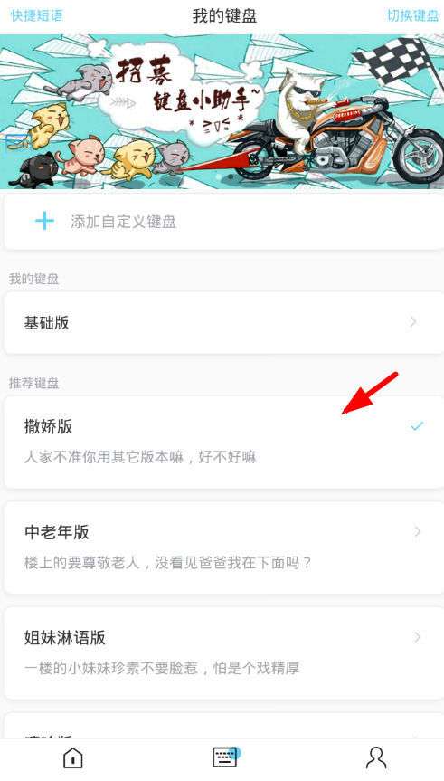 5、最后在页面的下方点击“选择撒娇版键盘”;按钮,就切换成功了。