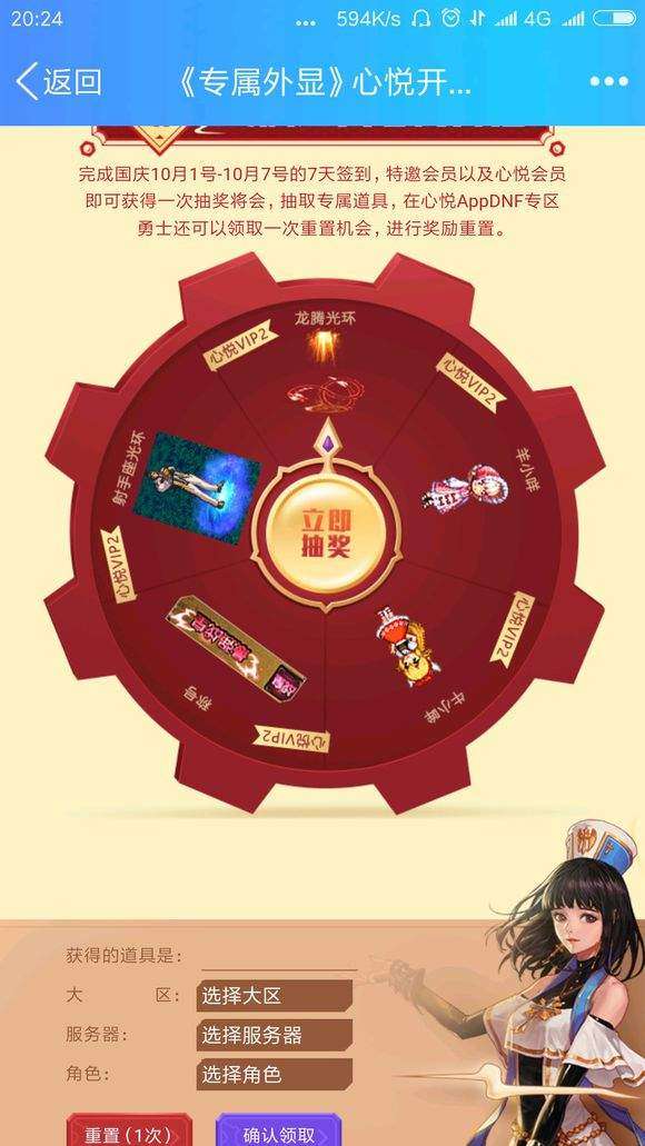 国庆1-7号连续签到,特邀会员以及心悦会员可以获得一次抽奖机会,抽取专属道具,在心悦appdnf专区勇士还可以领取一次重置机会进行奖励重置。