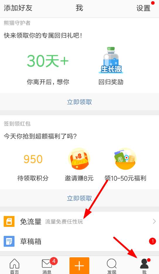 1、用户们现在要是想开启微博免流量服务,那就应该从右下角点击进入个人中心,然后通过下方列表找到“免流量”的服务。