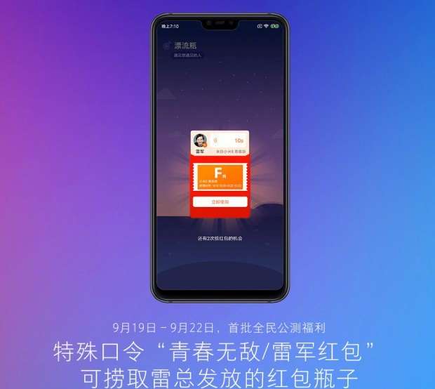 从2018年9月19日至9月22日期间,小米小爱同学的官方送出了公测的福利。大家只需要打开小爱同学,并且大喊口令:“青春无敌/雷军红包”,就可以捞取雷军发放的红包瓶子。