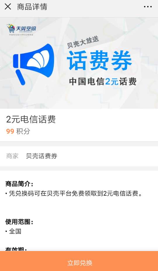 有需要的朋友们可以通过下方的地址链接进入活动页面:点击此处,接着在其中点击“立即兑换”按钮,就能够使用99积分来成功兑换2元电信手机的话费哦!