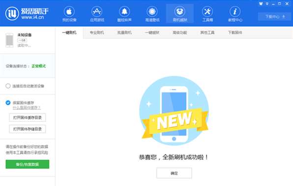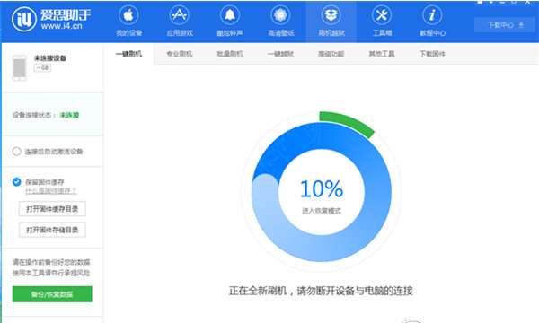 为了适合小白果粉降级,小编还是建议您使用爱思助手进行降级,这样容错率就会大大降低。使用数据线连接这个刷机工具,点击进入“刷机越狱 --> 一键刷机”界面,在下方下载IOS11.4.1固件,下载完之后,点击“立即刷机”,切记千万不要勾选“保留用户资料刷机”,否则会刷机失败或者刷机成功后无法开机。”