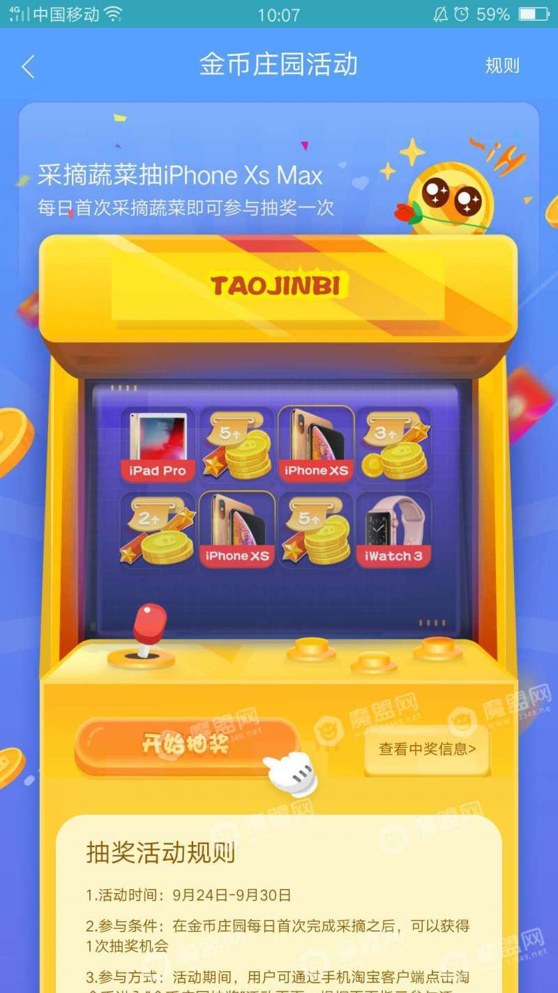 3、活动细则:活动期间,用户首次在淘宝金币庄园完成收菜之后,将获得一次抽奖机会,每一位用户每天最多可以抽一次奖。值得注意的是,抽奖机会不能累计,当天未抽奖机会将失效。