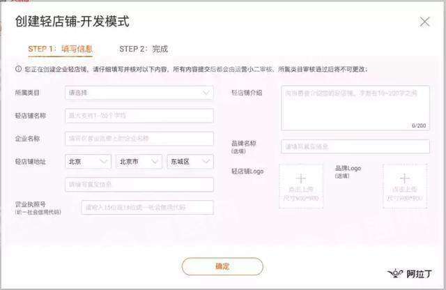 2.创建轻店铺,选择正确的服务类目,上传资质;(目前仅支持开发模式,通过模板创建方式敬请期待。)