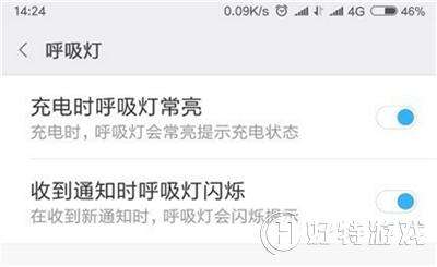 4、在【呼吸灯】设置中,有两项,出厂都是开启状态,一项是【充电时呼吸灯亮】,一项是【收到通知时呼吸灯闪烁】,这两项需要修改,根据个人情况进行配置。