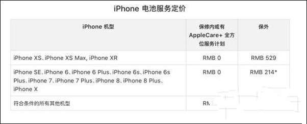需要注意的是,2018年12月31日之前,iPhoneSE、iPhone6、iPhone6Plus、iPhone6s、iPhone6sPlus、iPhone7、iPhone7Plus、iPhone8、iPhone8Plus、iPhoneX手机的保外电池服务的费用为RMB214(保外)。