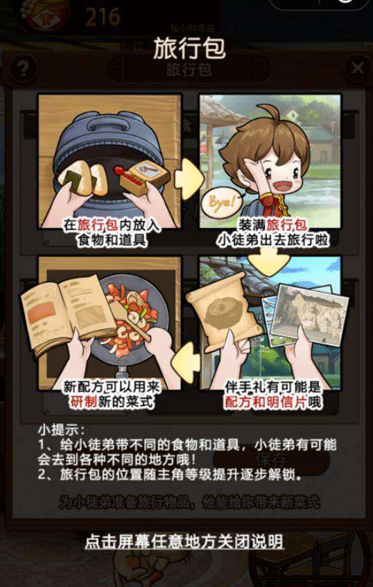 道具旅行包:可以在旅行包中放入食物和,装满背包可以出去旅游了。新配方可以用来研制新的菜谱,也可以明信片。