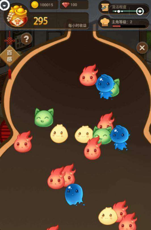 合成:两个相同的精灵和合成一个大的,然后将其拖到右下角的回收桶里进行回收,可以获得金币。