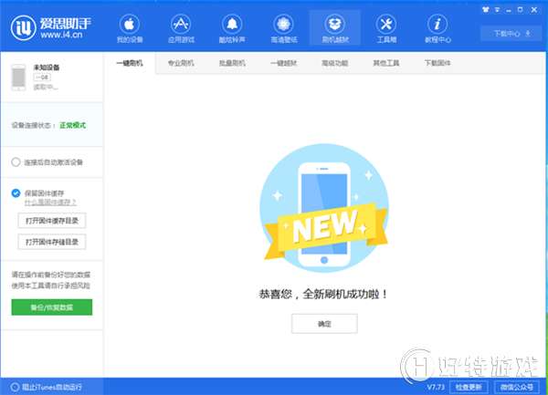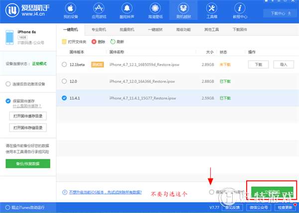 为了适合小白果粉降级,小编还是建议您使用爱思助手进行降级,这样容错率就会大大降低。使用数据线连接这个刷机工具,点击进入“刷机越狱 --> 一键刷机”;界面,在下方下载IOS11.4.1固件,下载完之后,点击“立即刷机”;,切记千万不要勾选“保留用户资料刷机”;,否则会刷机失败或者刷机成功后无法开机。”;