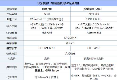 骁龙660是高通去年发布的中端处理器,今年还推出了骁龙660 AIE,主要加入AI支持,其它不变。骁龙660可以看作今年骁龙710的低配版。下面我们来看看麒麟710和骁龙660的参数区别,如下表所示。