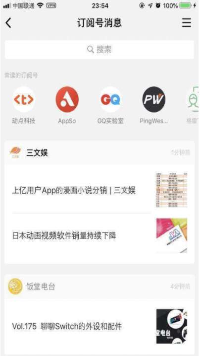 右上方的菜单键依然能够用来查看完整的订阅号列表,至于上一版本就已经出现的“未完成的功能”选项,在这一版本依然以这样的状态存在。