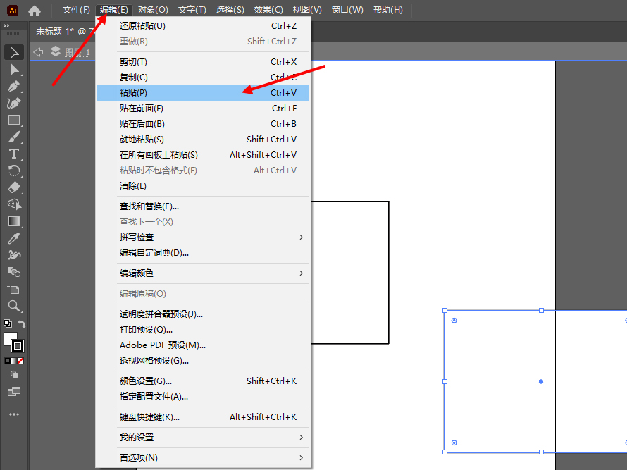 2、点击选择工具并选中矩形,点击编辑,点击复制。