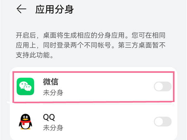 2、选择需要分身的应用,将【开启应用分身】后面的开关打开,在桌面就会显示两个微信图标,分别进行登录即可。