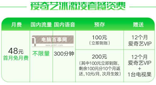 根据页面显示,爱奇艺冰激凌套餐月费为48元/月,首月可免费使用,套餐包括国内流量不限量+300分钟国内语音,预存100元话费可获得12个月爱奇艺VIP会员,预存200元,可获得12个月爱奇艺VIP+1台爱奇艺电视果。