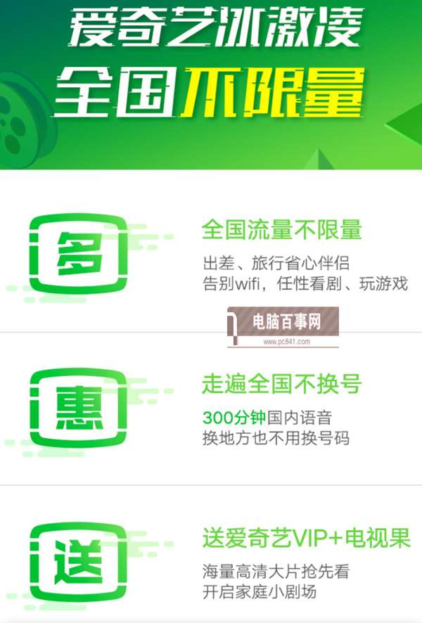 很显然,这款套餐是中国联通推出的针对爱奇艺用户推出的不限量套餐卡,限量范围是全国流量,购买预存话费可以获得爱奇艺VIP会员。