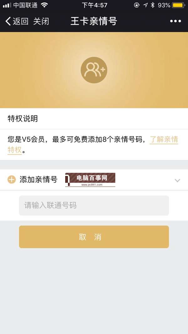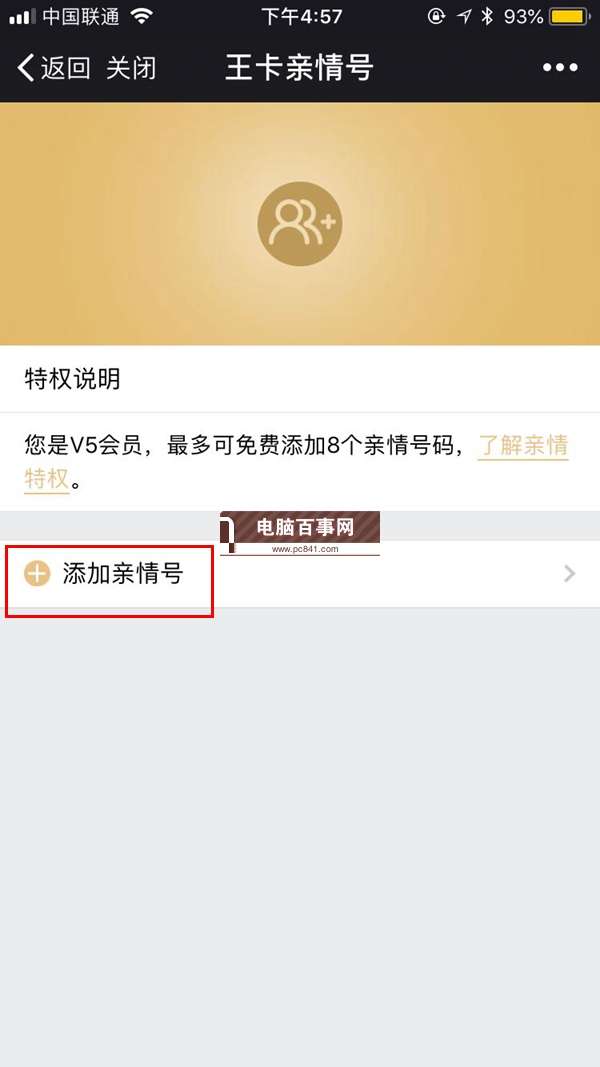 3、接下来点击下方的【添加亲情号】即可,前提是添加任何联通号,不能是移动号和电信号,如下图所示。