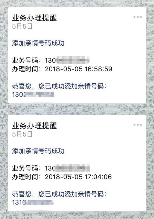 一旦添加成功,亲情号码就会显示【解除】,同时我们也可以在公众号受到办理亲情号码成功的提醒。