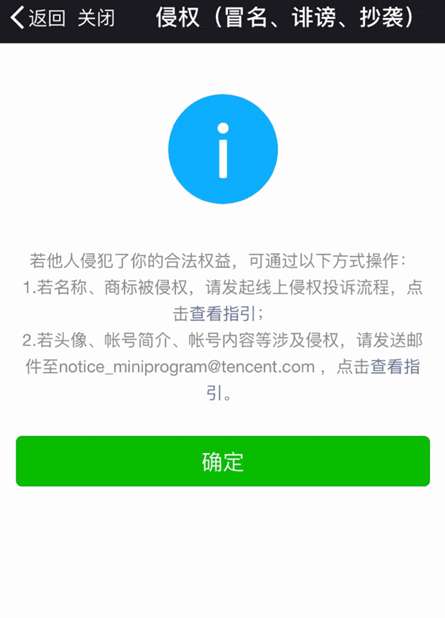 在侵权处理上,提供侵权投诉入口。用户可以在小游戏的右上角点击“…”查看侵权投诉指引,可直接将侵权证据提供至notice_miniprogram@tencent.com进行投诉。