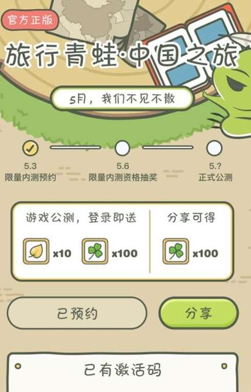 小伙伴们还记得你们的蛙儿子吗?之前的日本佛系小游戏,如今中国版将要开启公测了,旅行青蛙中国之旅的激活码谁有呢?乖乖小编为大家带来旅行青蛙中国之旅激活码的相关资讯,感兴趣的小伙伴赶紧来看看吧!