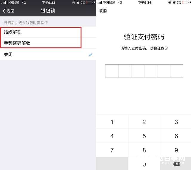 3、微信钱包锁默认是没有开启了,如果微信钱包中有钱的话,强烈建议开启钱包锁,以更好的保护资金安全。点击进入钱包锁后,可以看到有“指纹解锁”和“手势密码解锁”两个选项,大家可以根据自己的习惯,选择一个。比如,小编点击勾选“指纹解锁”,之后只要输入一次微信支付密码验证确认,就可以开启成功了。