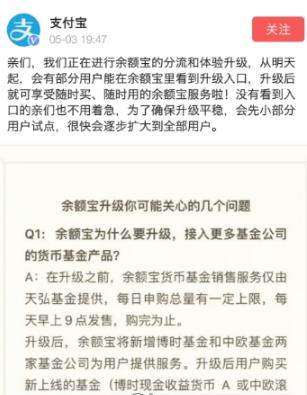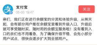 从5月4日起,用户可以在余额宝里面看到升级入口。