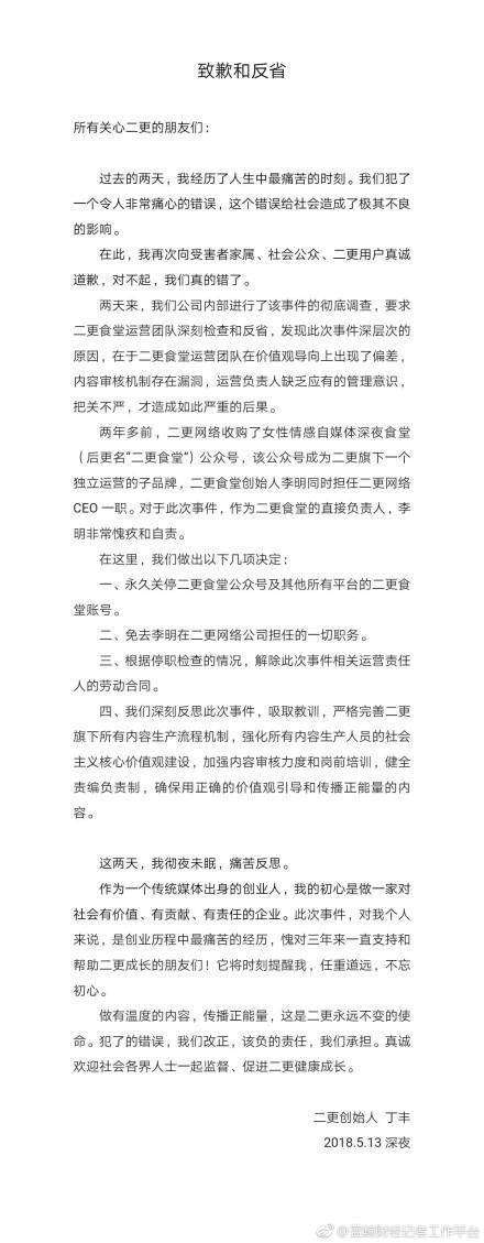 昨晚,二更创始人丁丰发布致歉信,宣布二更食堂公号永久关闭,同时,免去李明在二更网络公司担任的一切职务,解除此次事件相关运营责任人的劳动合同。