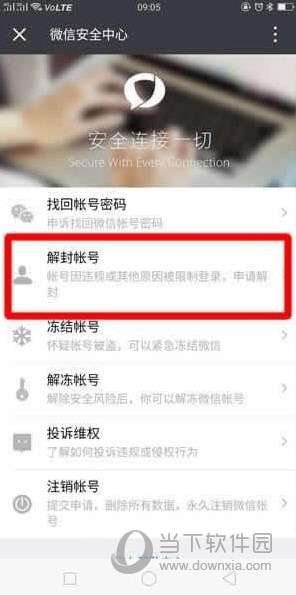 第四步:进入【微信安全中心】界面后,点击【解封账号】申请或其它操作;