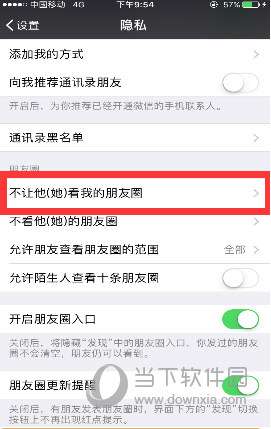 4、这时候我们来到隐私设置界面,从界面上可以找到朋友圈,在朋友圈的下方点击不让他(她)看到我的朋友圈