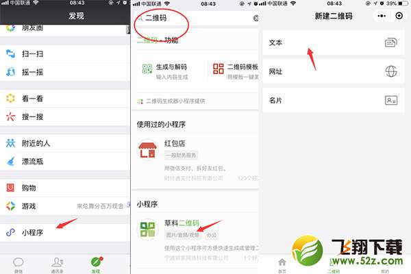 1、首先我们需要拥有一个微信APP,这个大家肯定都会有,在发现里打开小程序,在搜索框输入关键词“二维码”,点击进入你最感兴趣的二维码生成器小程序,在新建的二维码里点击文本,如图: