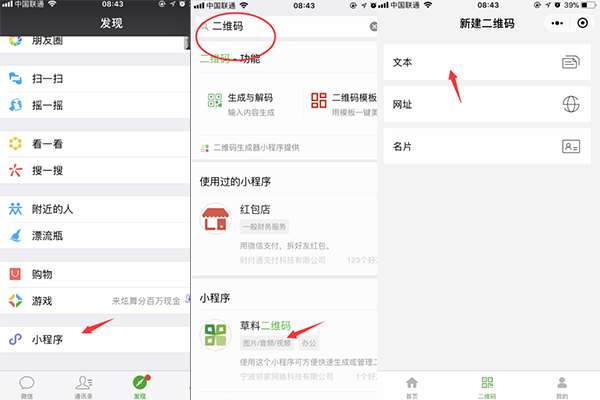 1、首先我们需要拥有一个微信APP,这个大家肯定都会有,在发现里打开小程序,在搜索框输入关键词“二维码”,点击进入你最感兴趣的二维码生成器小程序,在新建的二维码里点击文本,如图: