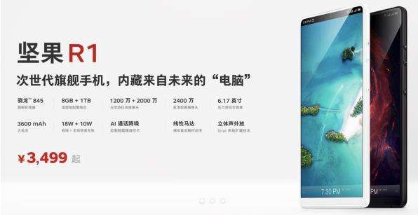 而作为锤子科技年度旗舰手机坚果R1,同时也是坚果TNT工作站(显示器)核心“主机”,被誉为“次世代旗舰手机,内藏来自未来的‘电脑‘“,拥有强悍性能与极速处理能力、旗舰级相机、以及更加惊艳的工艺外观。坚果R1搭载骁龙845顶级处理器、6GB超大内存起,最高支持8GB运存,最高1TB存储空间,安兔兔跑分达到27.5万,支持TV OUT 大屏游戏;后置1200万+2000万双摄像头,2400万前置摄像头,采用索尼旗舰级传感器IMX363+OIS四轴光学防抖+EIS 4K视频防抖,在多种场景下照片及视频拍摄都有出众表现,拍照水准进入第一旗舰梯队;软件交互方面新增全局压感快捷,效率三件套(闪念胶囊、大爆炸、一步)全面升级,无处不在的AI加持,同时支持多按键壳套,让手机使用效率更高;工业设计方面,采用6.17英寸18.7:9广色域全面屏,1500:1对比度,支持压力感应,屏占比高达84%,延续极简设计风格,隐藏式设计及指纹logo合二为一,四曲面3D玻璃后盖,视觉与手感上实现再次突破。