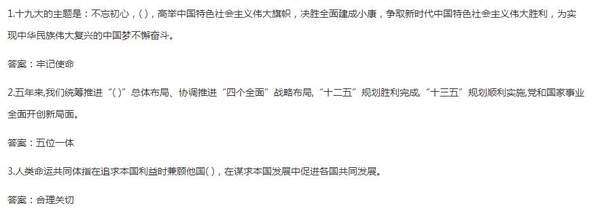 1.十九大的主题是:不忘初心,( ),高举中国特色社会主义伟大旗帜,决胜全面建成小康,争取新时代中国特色社会主义伟大胜利,为实现中华民族伟大复兴的中国梦不懈奋斗。