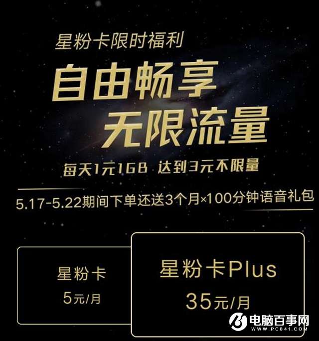 三星官方表示,在5月17日--5月22日期间下单星粉卡的用户可以获得连续三个月的100分钟语音通话。