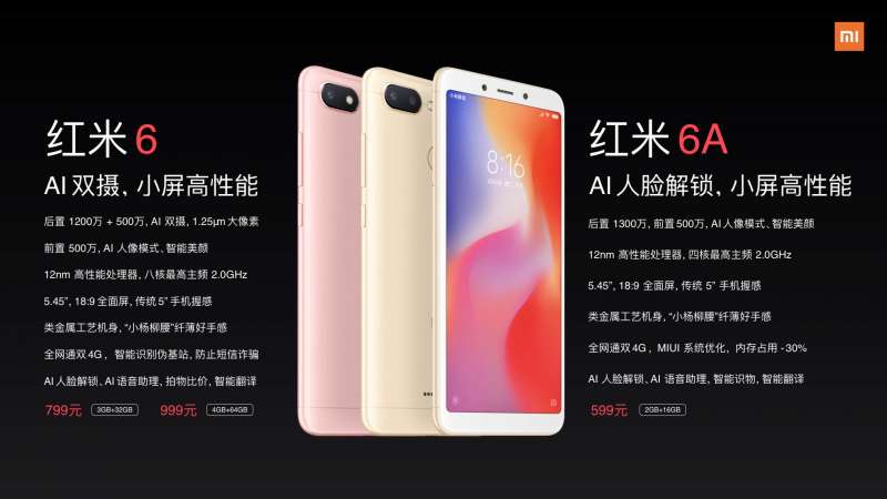 红米6a 2GB+16GB售价为599元,而红米6 3GB+32GB为799元、4GB+64GB的是999元。