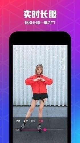 打开微视的拍摄按钮后,点击滤镜就能看到“长腿”效果,可以拖动下方的条形来选择不同程度的效果。下面的gif图是微视的效果。